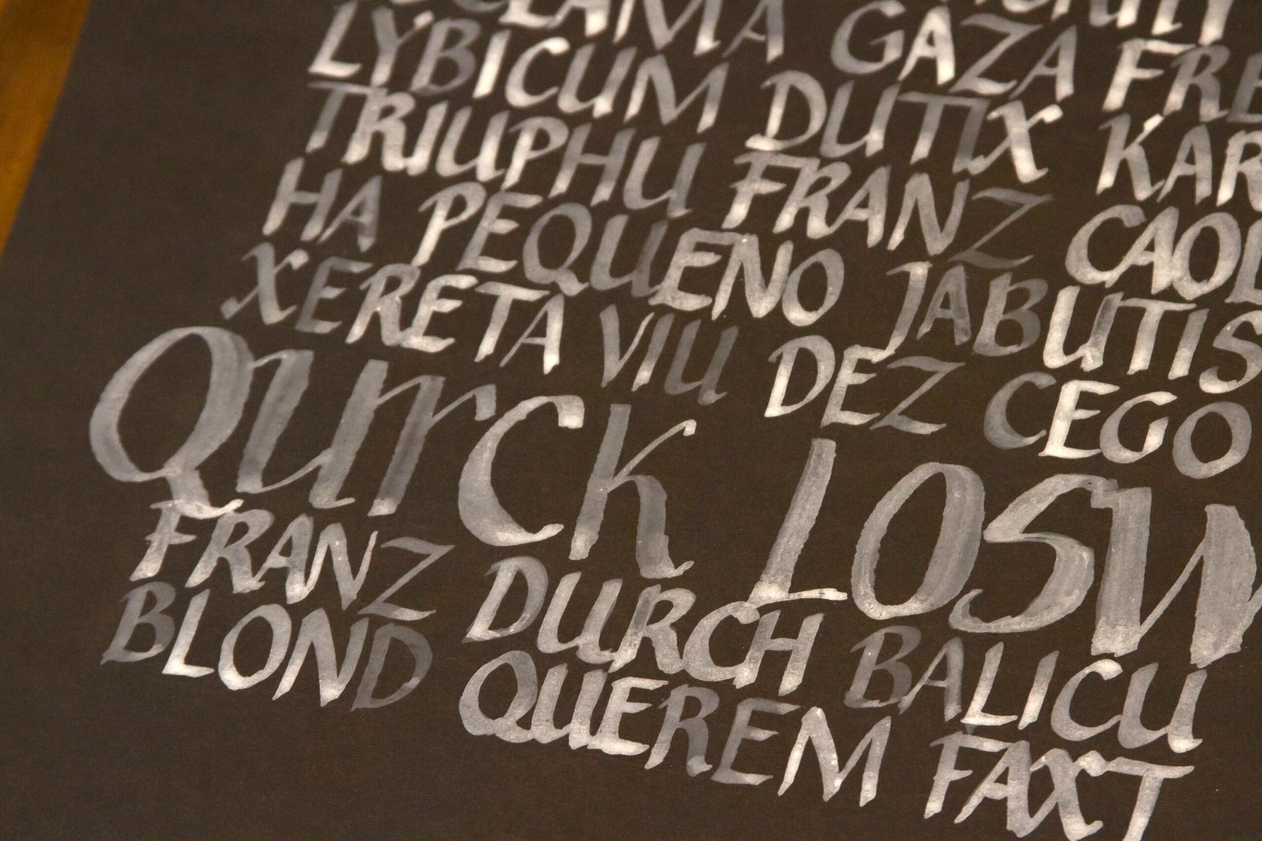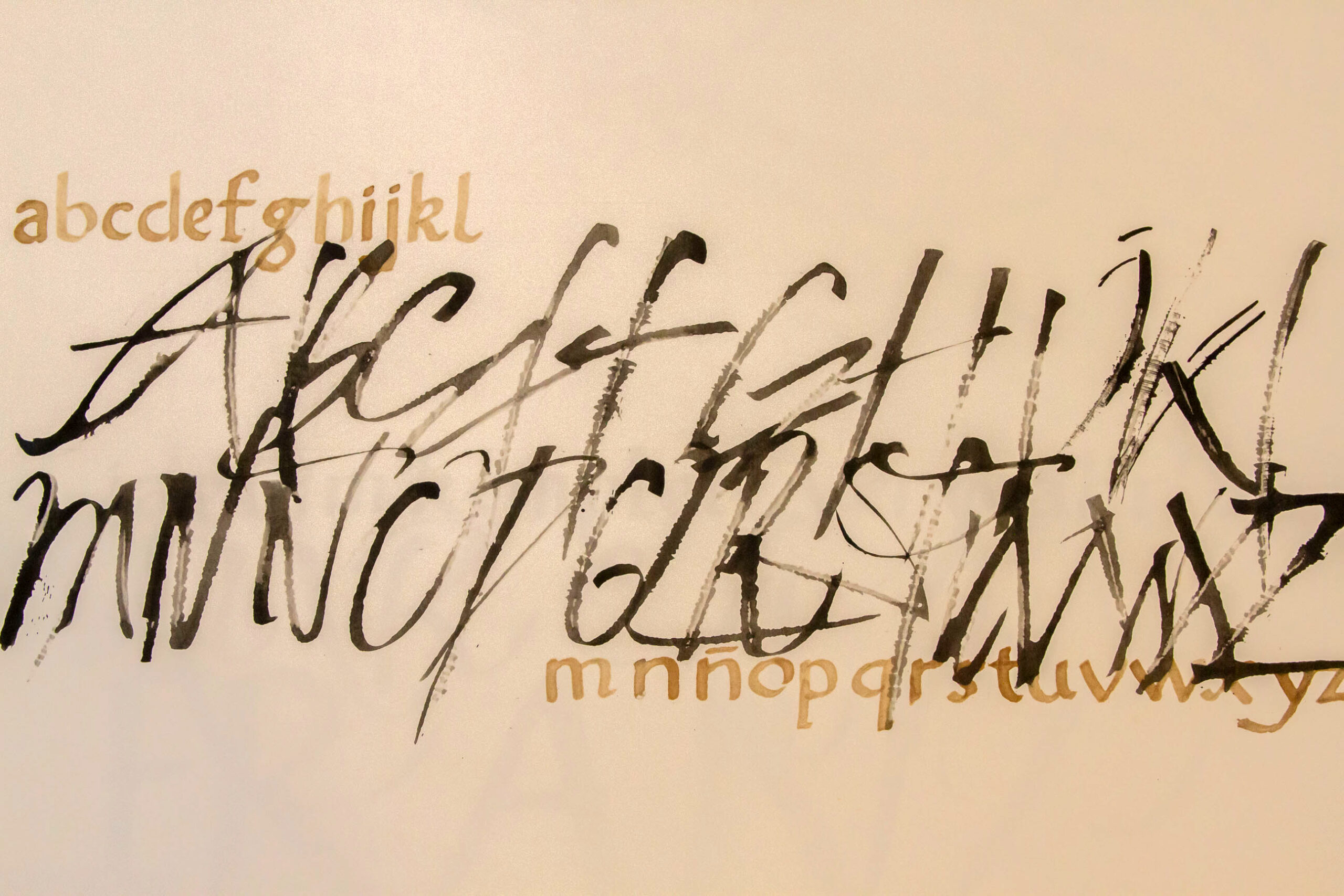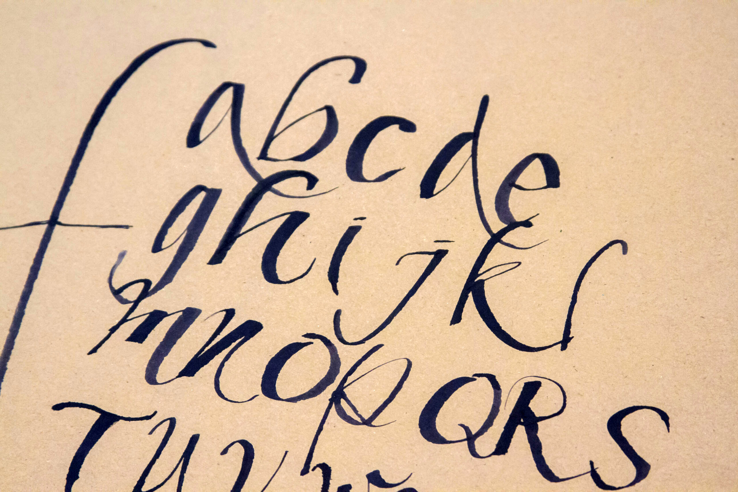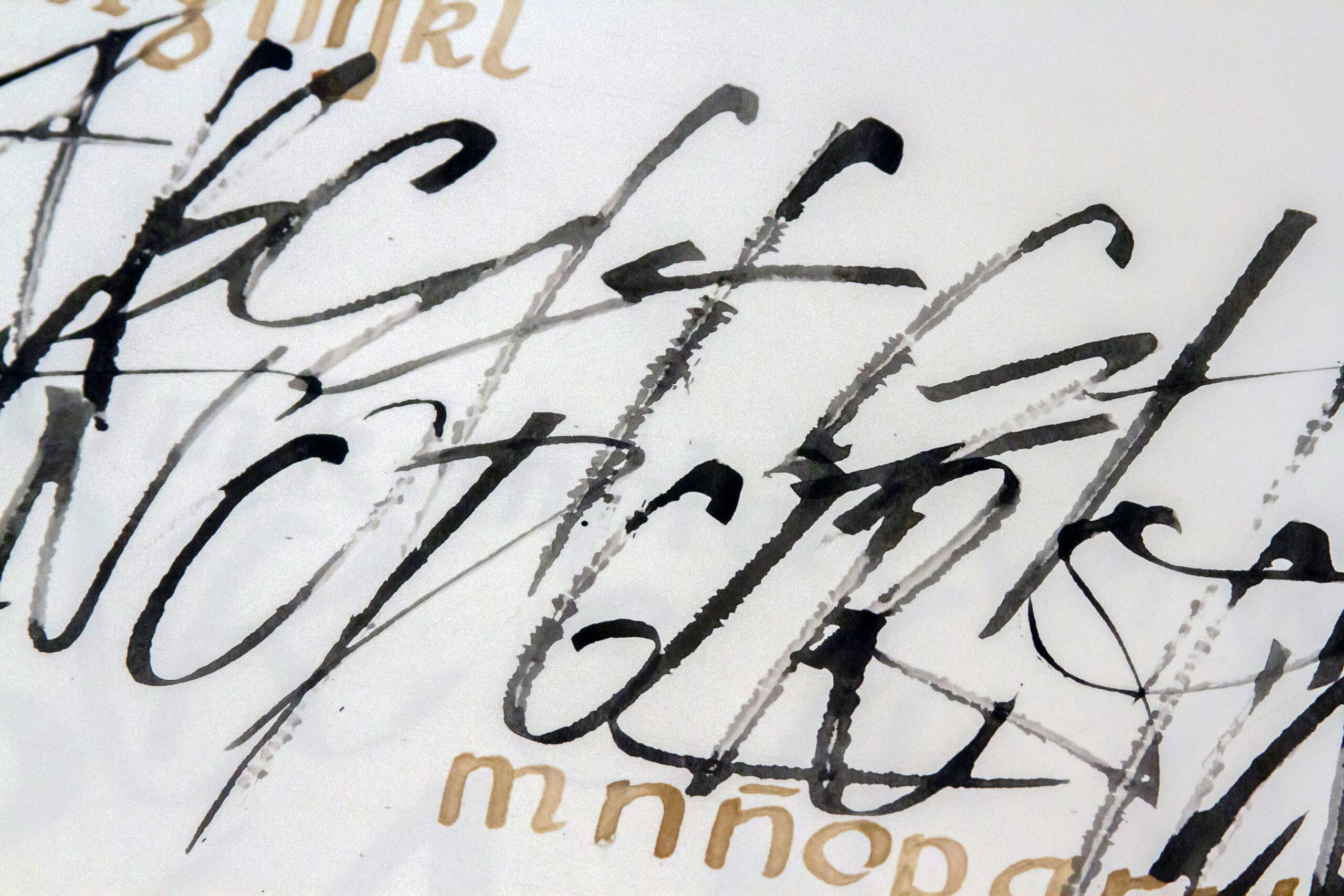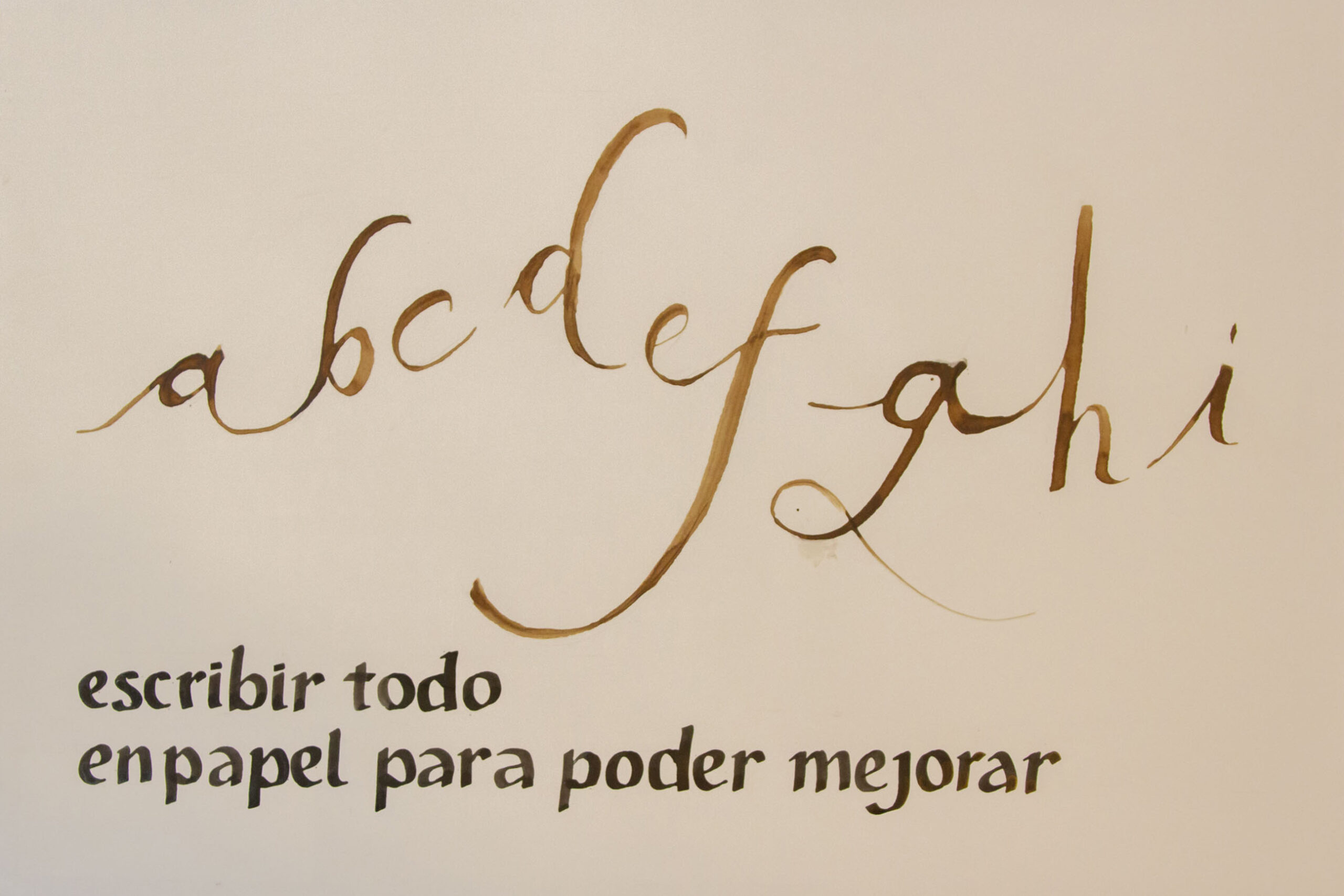 Signos y textos trazados con diferentes herramientas, medios y soportes. Entendemos y analizamos la morfología de los signos alfabéticos a partir de las herramientas (plumas chatas y tiralíneas), los medios (tinta, aguada, nogalina) y el soporte (papeles de diversos gramajes, texturas y color).