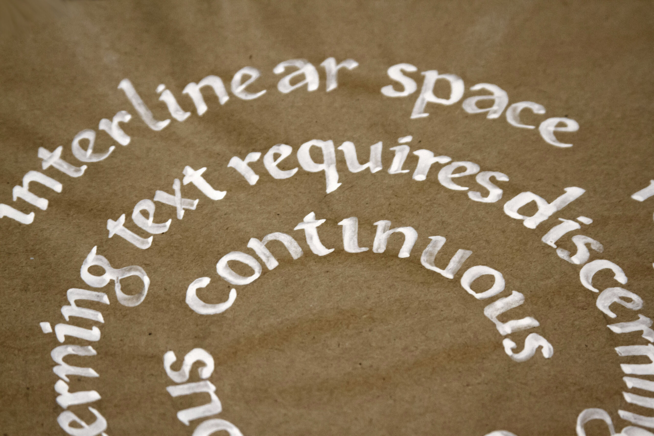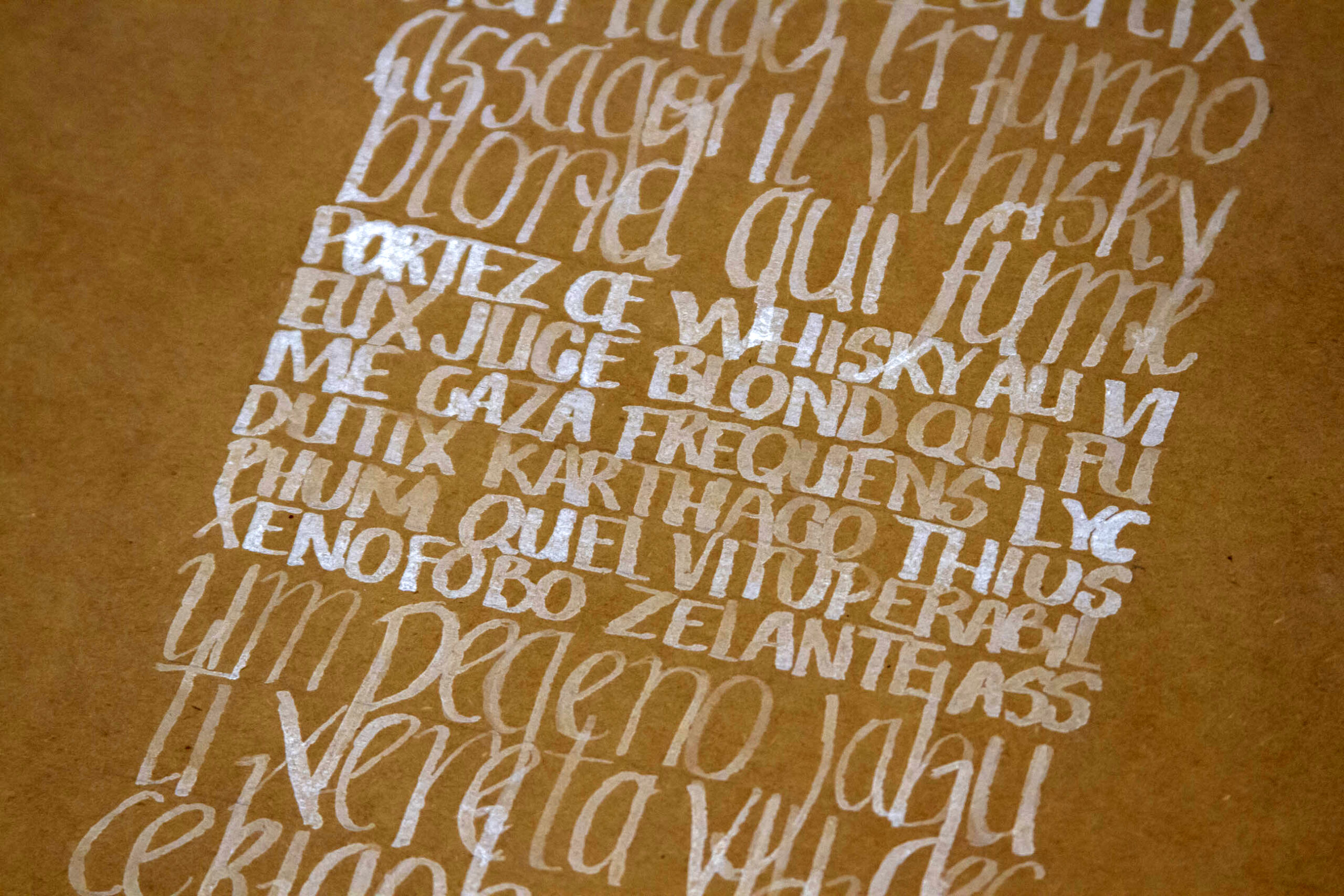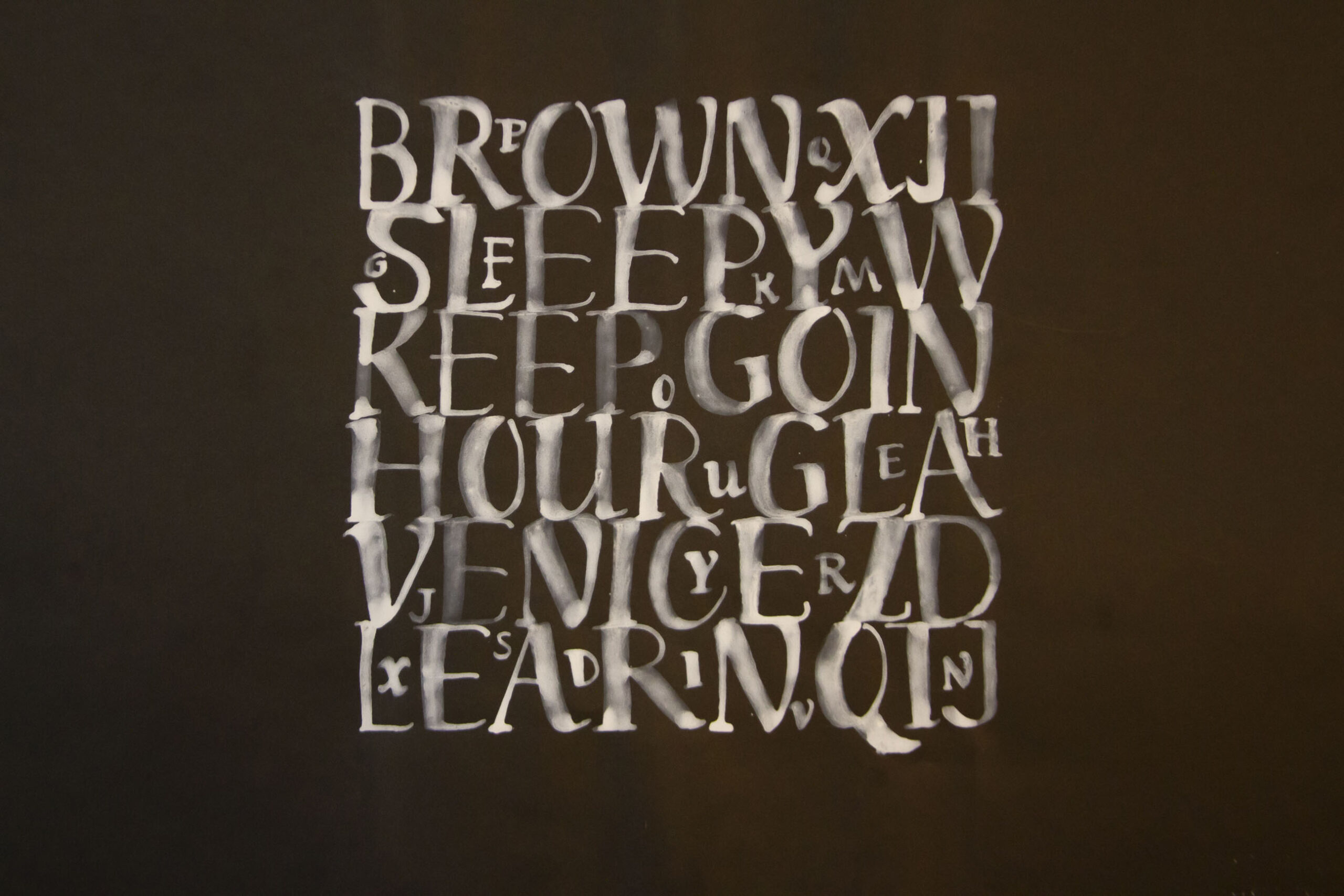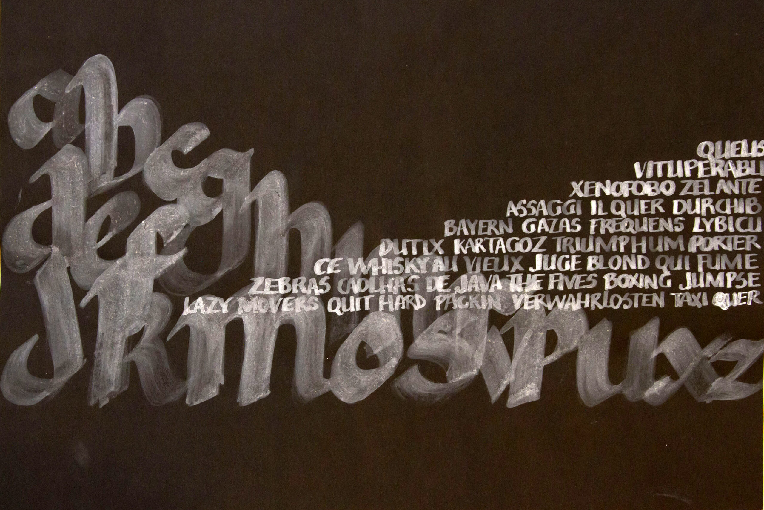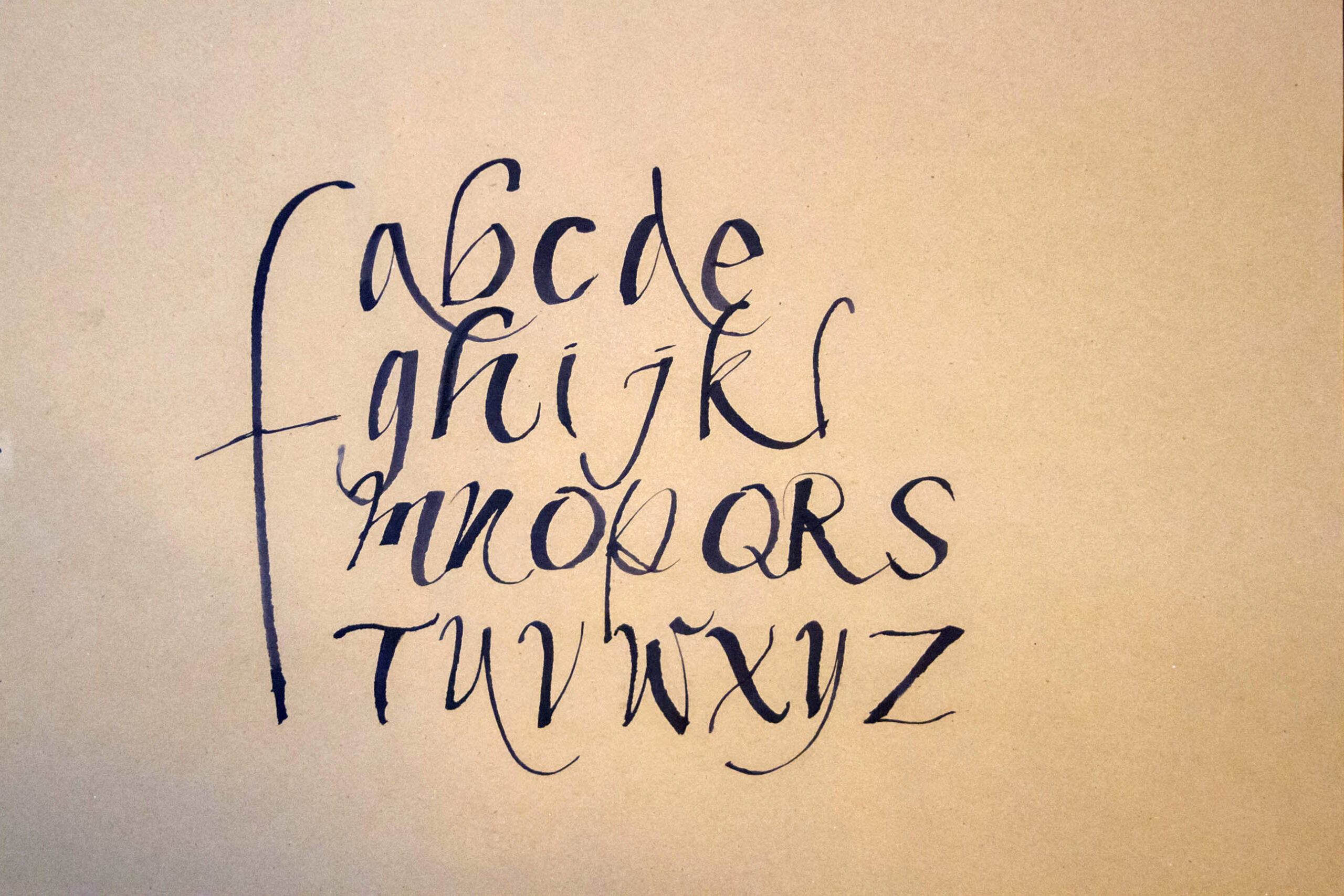 Signos y textos trazados con diferentes herramientas, medios y soportes. Entendemos y analizamos la morfología de los signos alfabéticos a partir de las herramientas (plumas chatas y tiralíneas), los medios (tinta, aguada, nogalina) y el soporte (papeles de diversos gramajes, texturas y color).