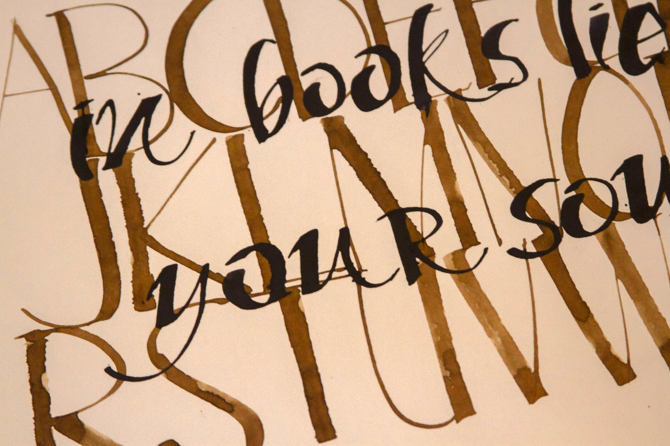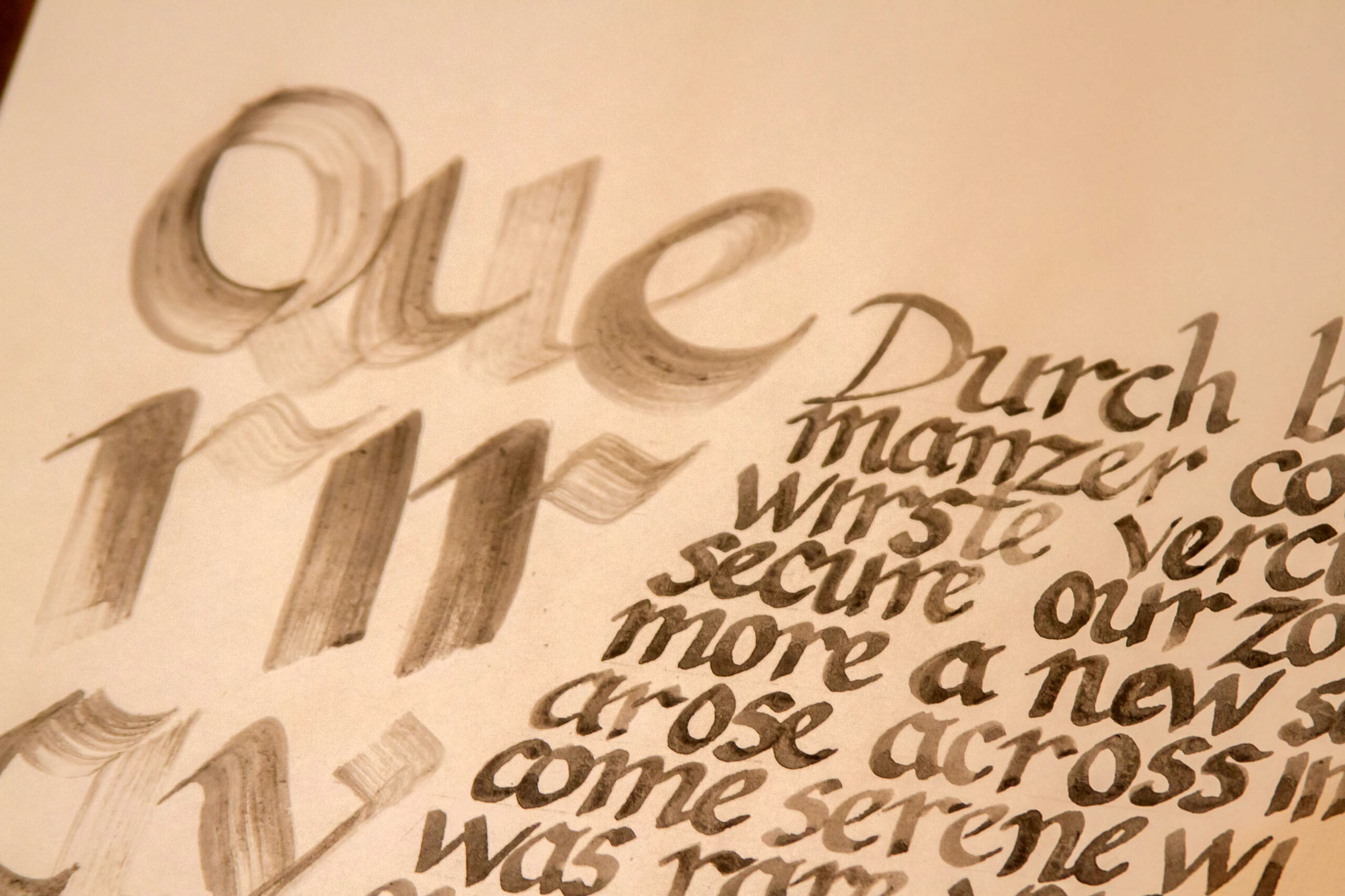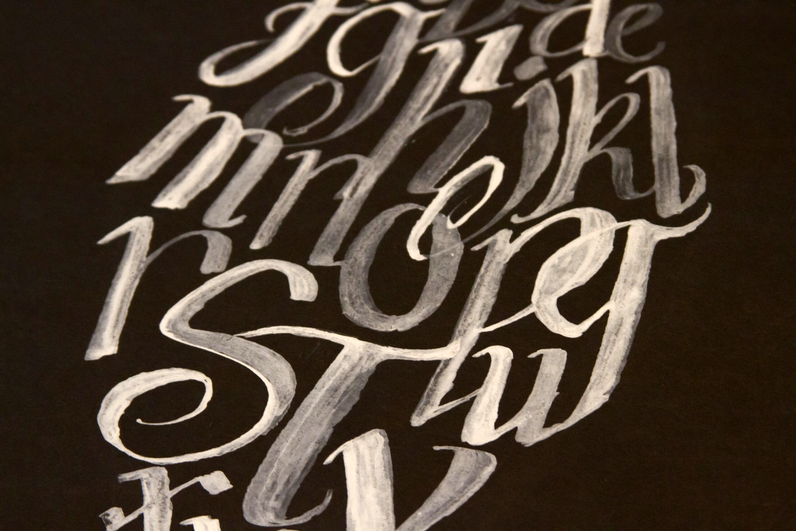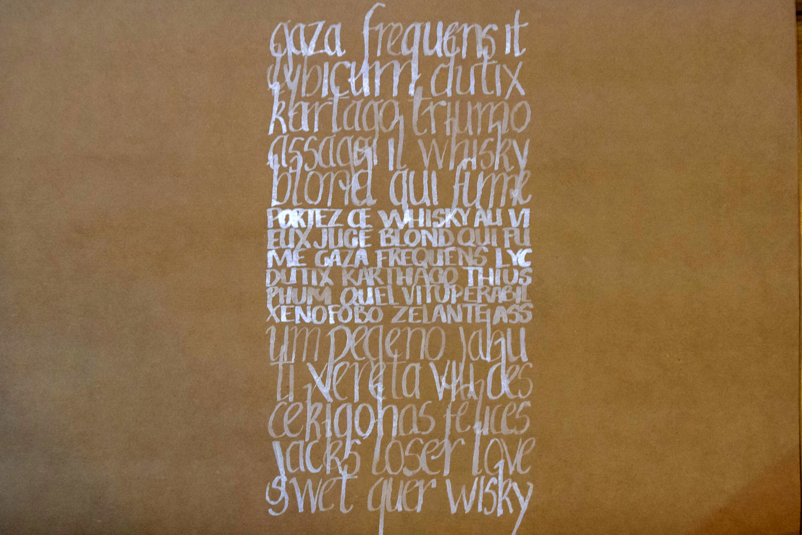 Signos y textos trazados con diferentes herramientas, medios y soportes. Entendemos y analizamos la morfología de los signos alfabéticos a partir de las herramientas (plumas chatas y tiralíneas), los medios (tinta, aguada, nogalina) y el soporte (papeles de diversos gramajes, texturas y color).