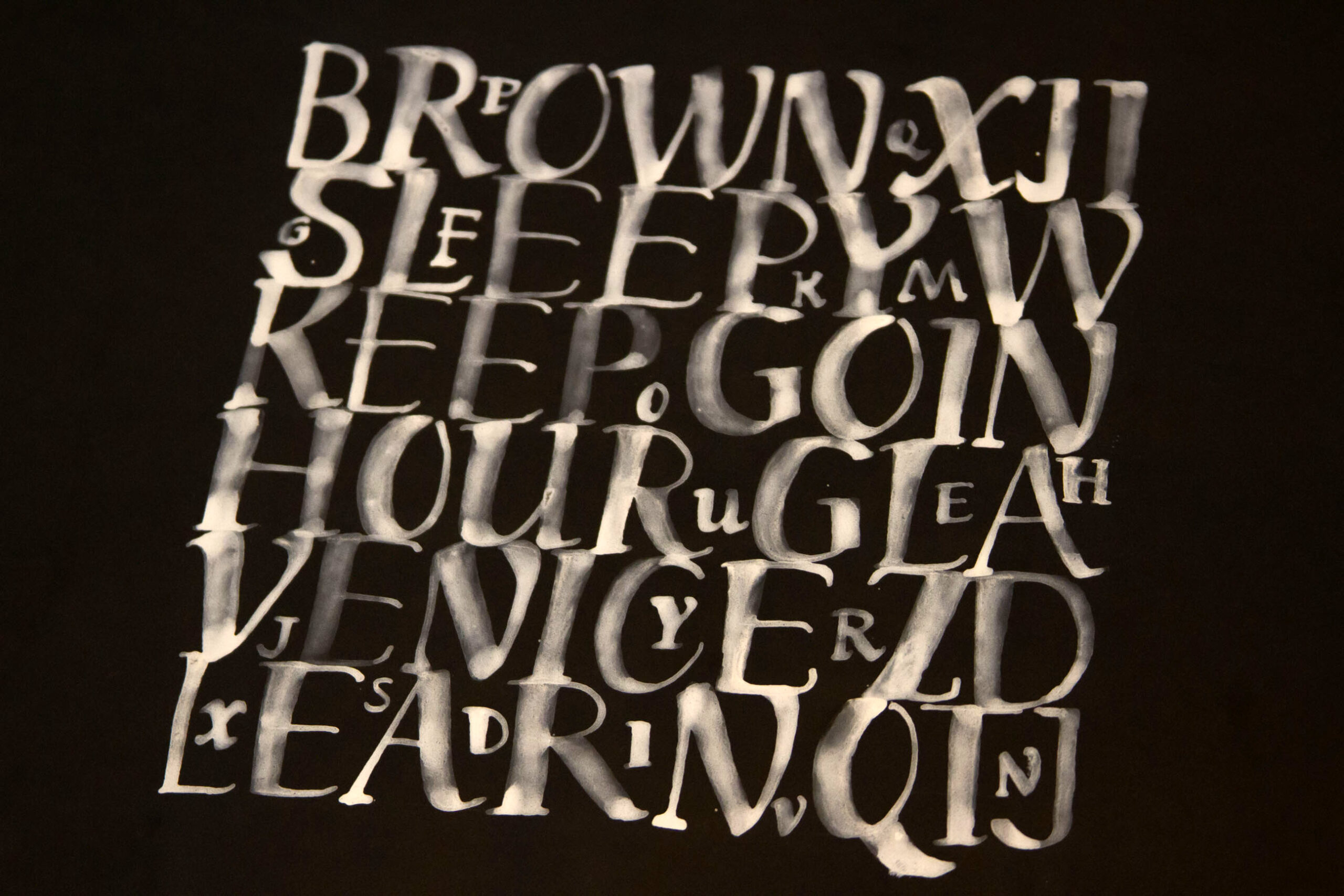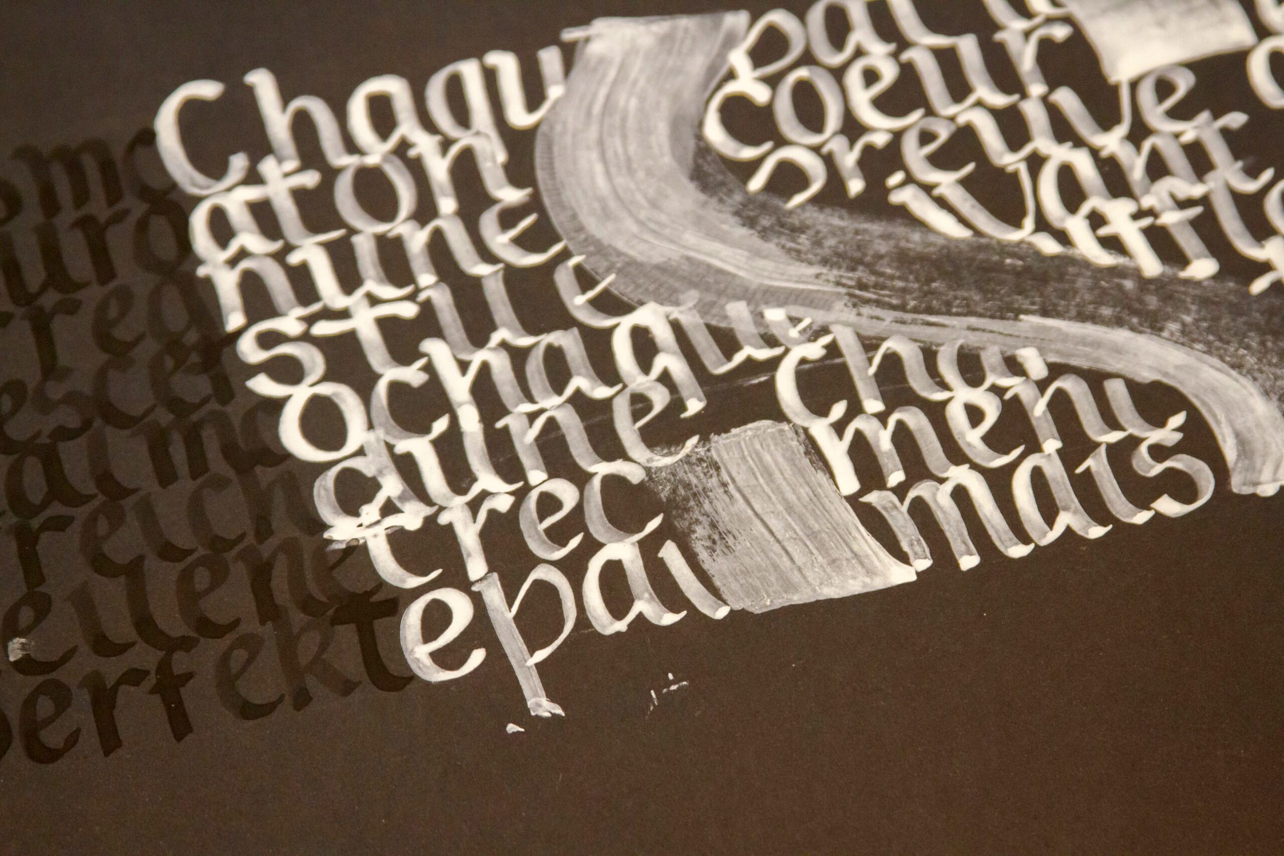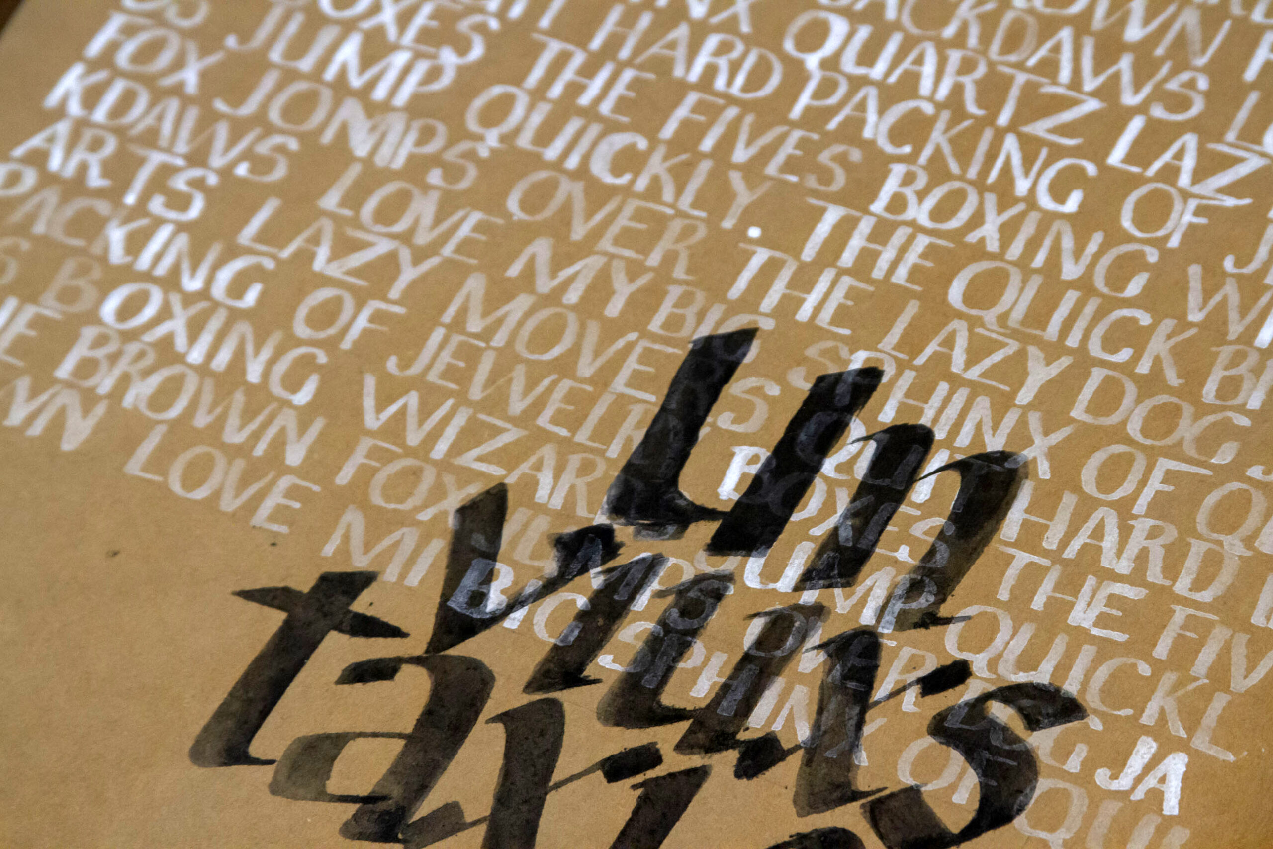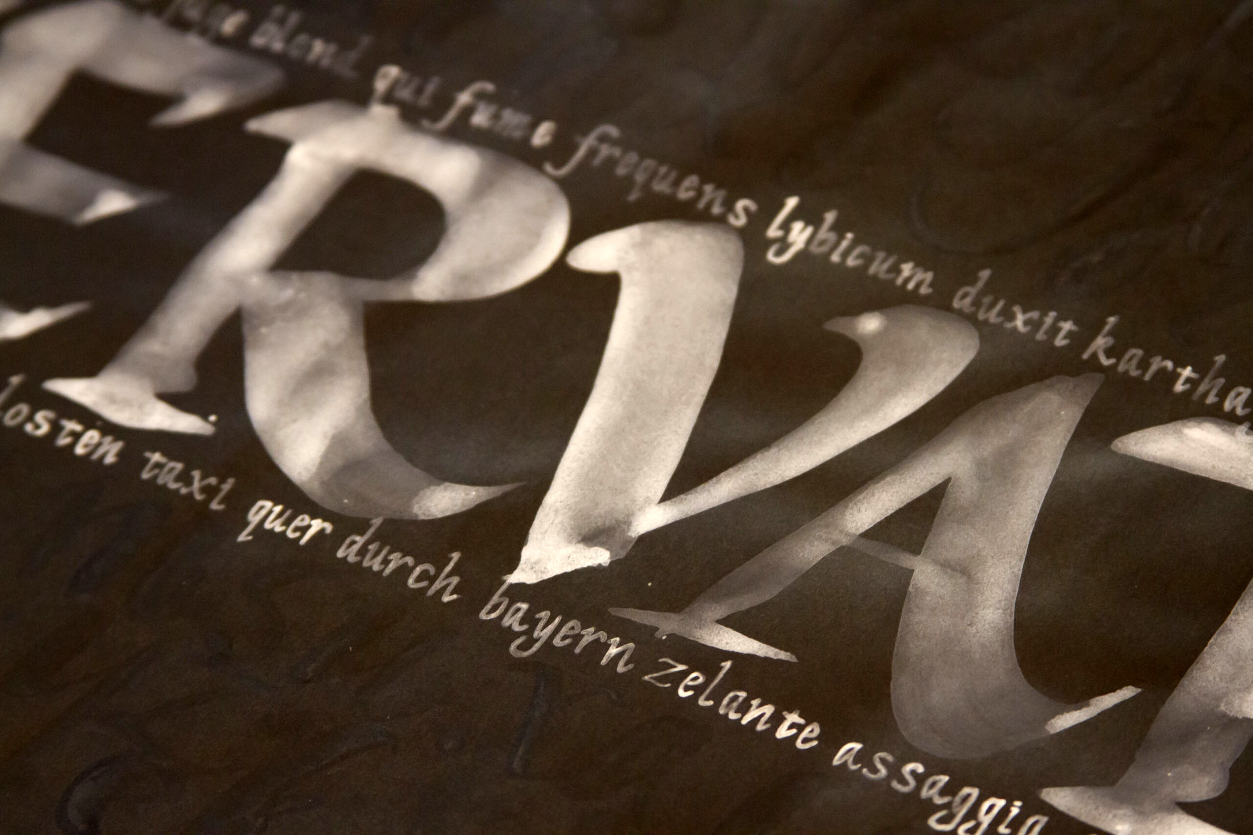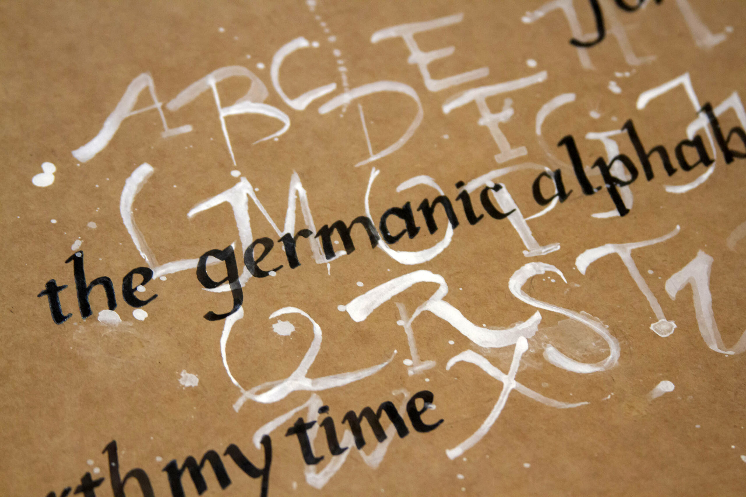 Signos y textos trazados con diferentes herramientas, medios y soportes. Entendemos y analizamos la morfología de los signos alfabéticos a partir de las herramientas (plumas chatas y tiralíneas), los medios (tinta, aguada, nogalina) y el soporte (papeles de diversos gramajes, texturas y color).