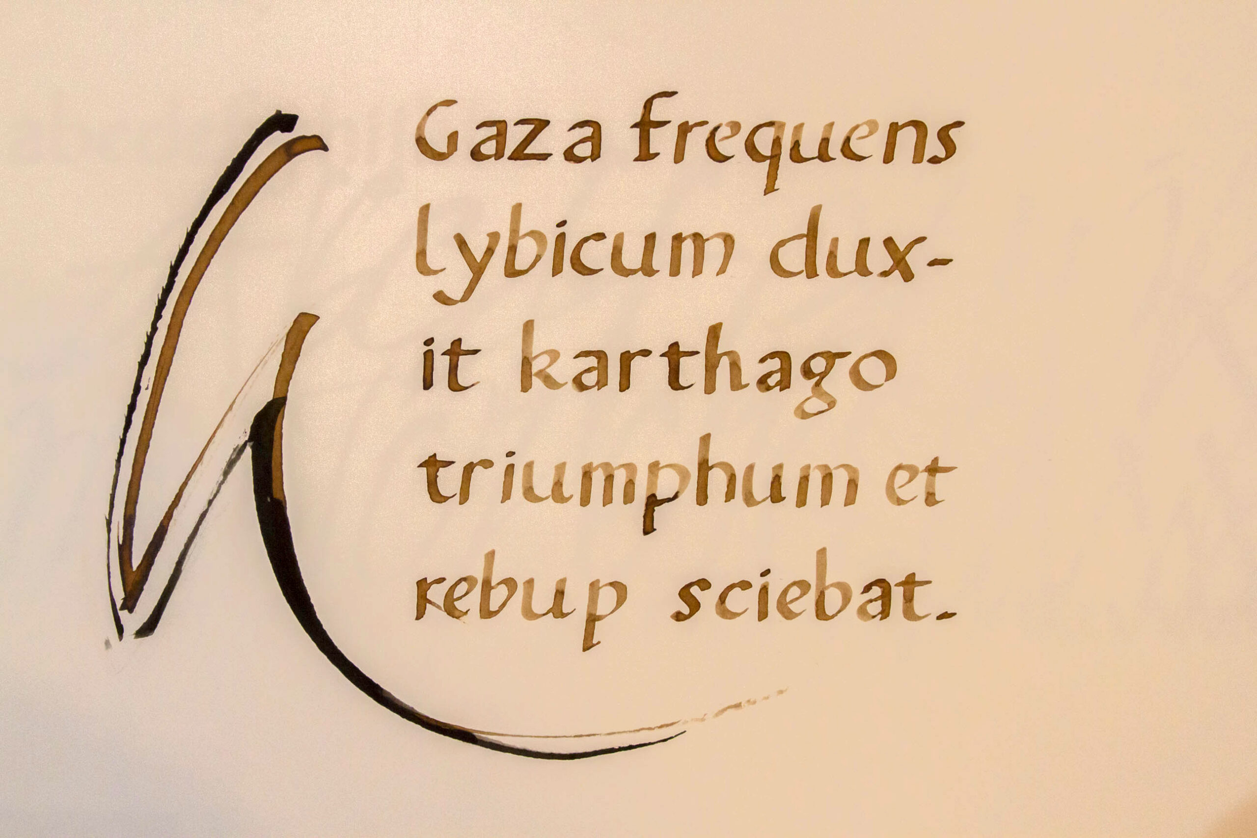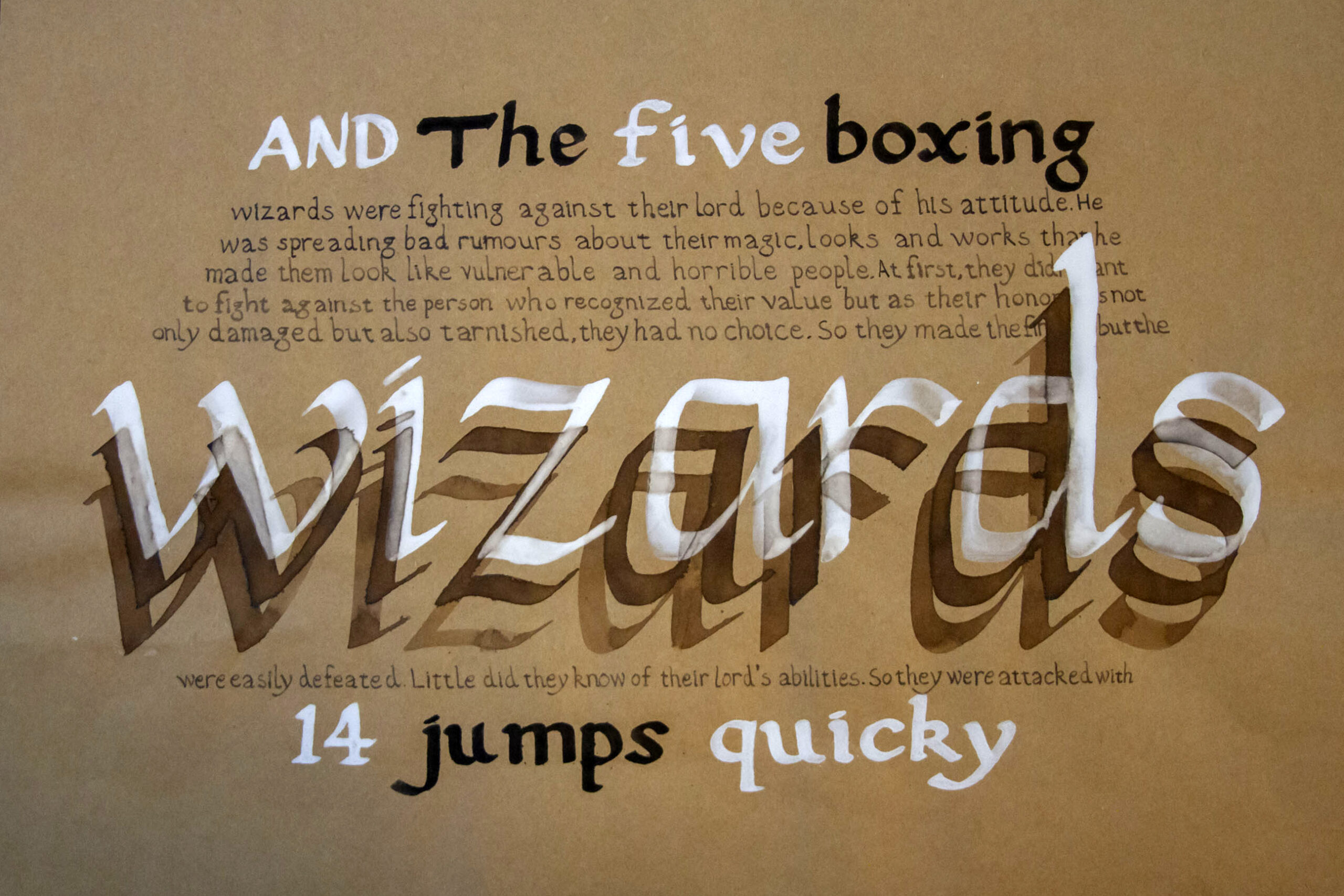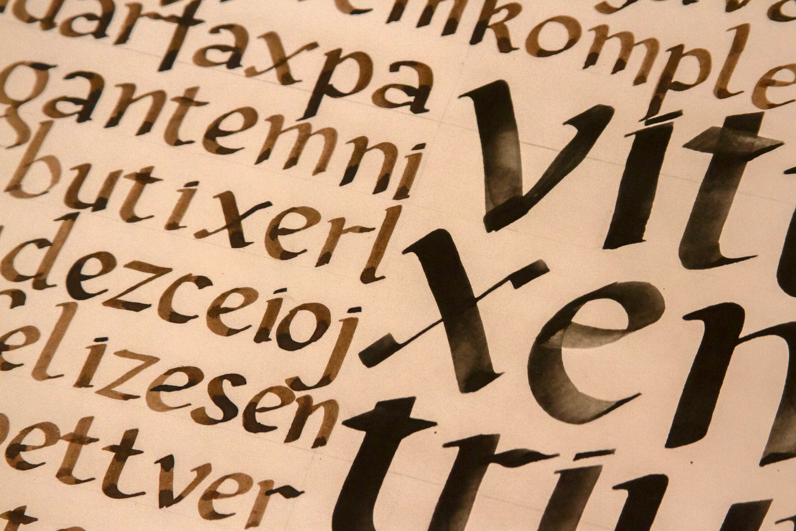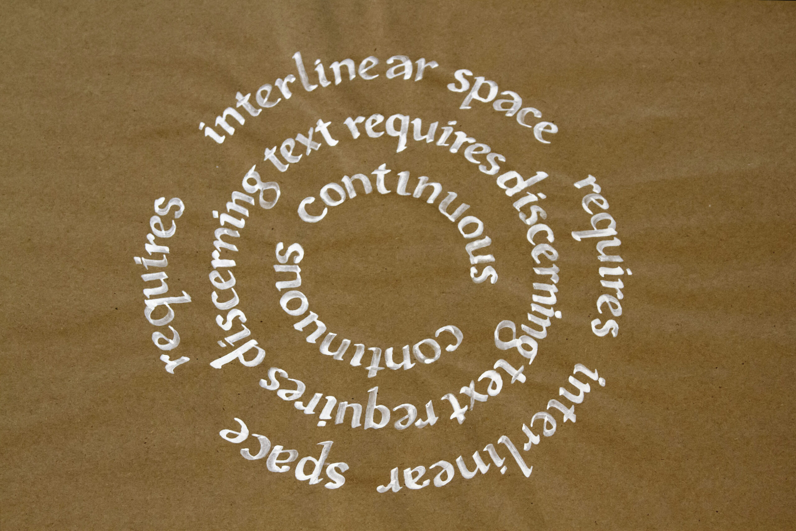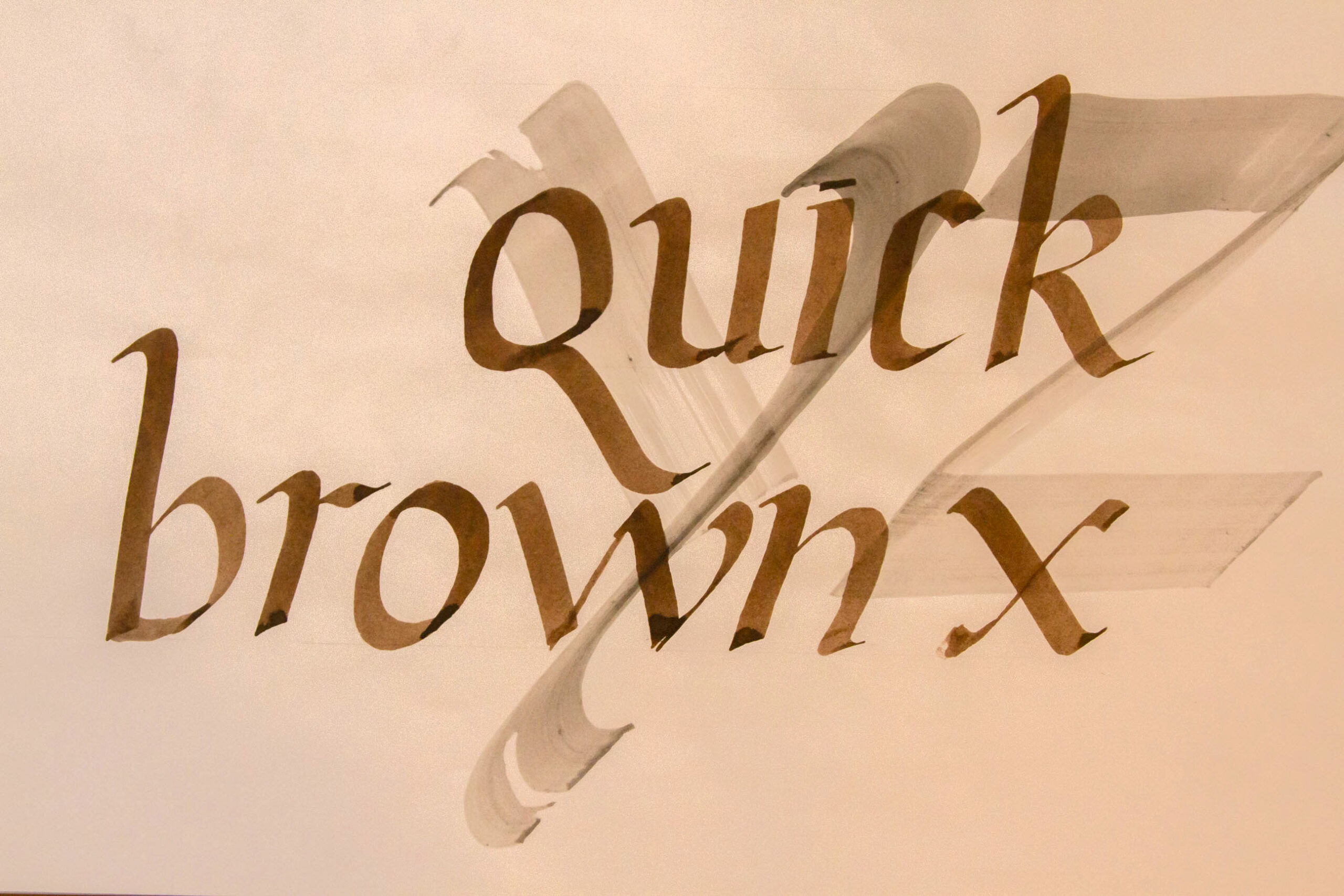 Signos y textos trazados con diferentes herramientas, medios y soportes. Entendemos y analizamos la morfología de los signos alfabéticos a partir de las herramientas (plumas chatas y tiralíneas), los medios (tinta, aguada, nogalina) y el soporte (papeles de diversos gramajes, texturas y color).